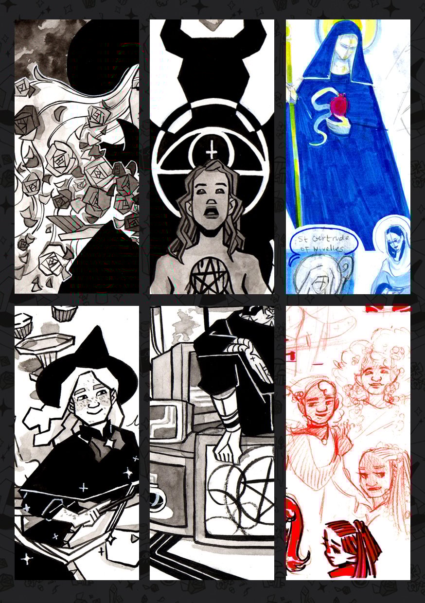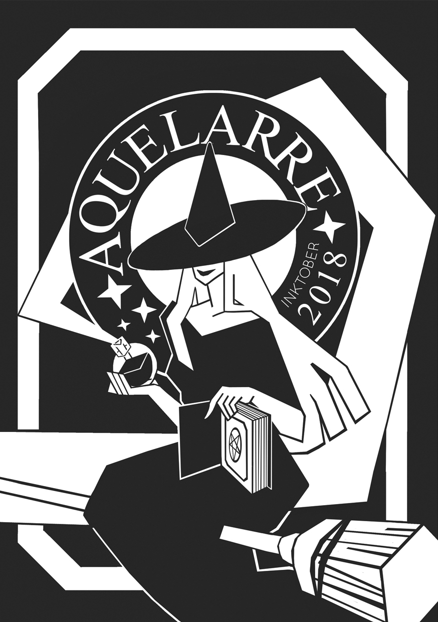 Aquelarre es un artbook con 31 ilustraciones a tinta hechas durante Inktober 2018 además de bocetos de proceso.